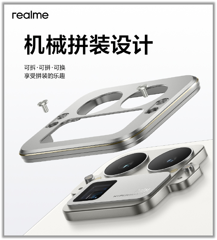 从视频中可见,更换相机模组的过程相当简便。只需拧下预装的模组,对齐您选择的新模组,然后重新拧紧即可。有趣的是,预计真我会单独销售这些可互换的模组。不过,更换模组所需的工具配件很可能将随手机零售盒一同提供。