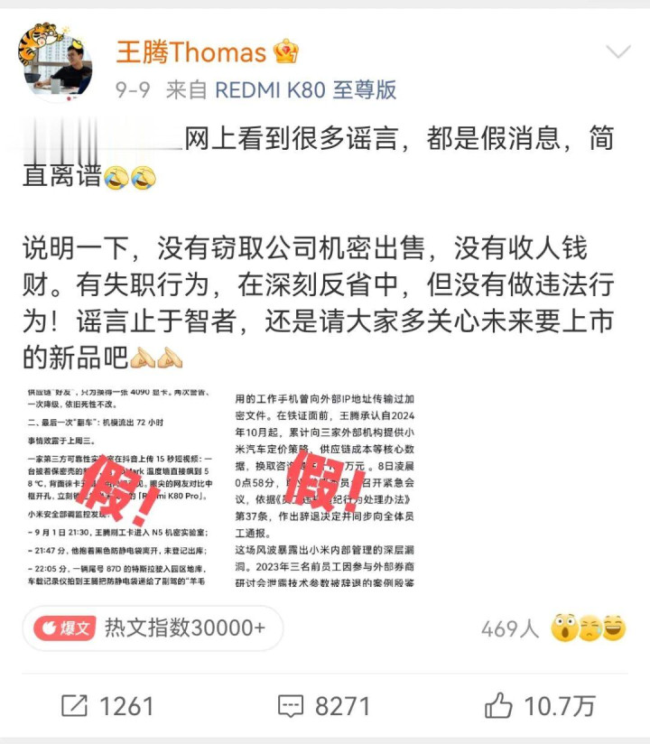 在一个月之前,小米的一则突然宣布王腾被辞退内部通告,让一众网友措手不及。在通告当中,小米更是毫不留情地指出,王腾泄露公司机密信息,且存在利益冲突等严重违规违纪行为。